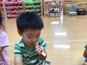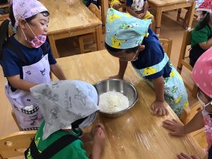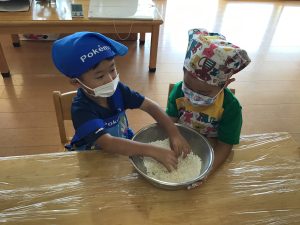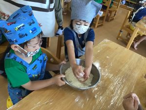 サラサラの粉を混ぜていくと、モチモチに変化する感触を楽しみました。