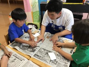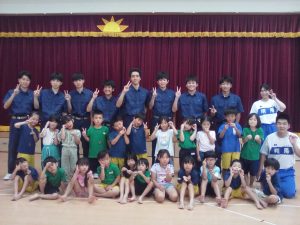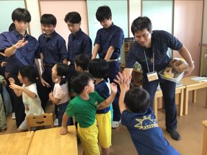 2~3人のグループに1人ずつお兄さん、お姉さんがついて教えていただきました。