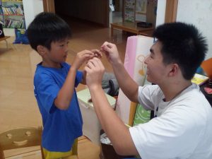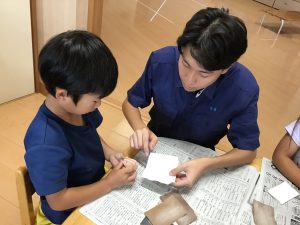 翔陽高校のお兄さんお姉さんに教えてもらい、木のペンダント作り挑戦!