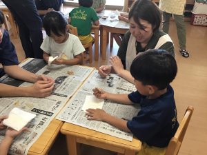紙やすりでしっかり削ることで木の感触や匂いを味わうことが出来ました。