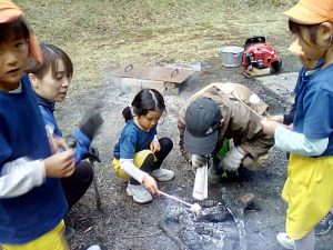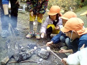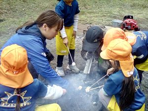 たき火でサツマイモ🍠、焼きおにぎり🍙、マシュマロビスケットサンドを作って食べました。