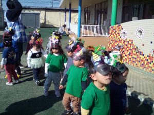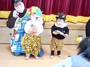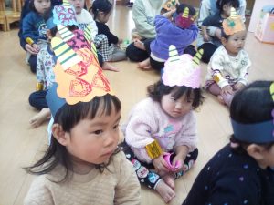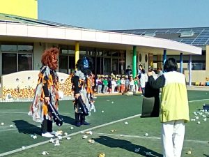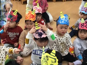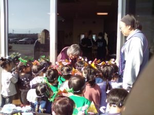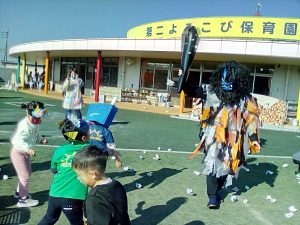 その後、うさぎ組(2歳児)は鬼の面を被り施設訪問へ