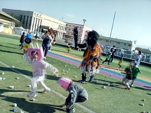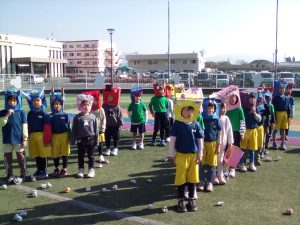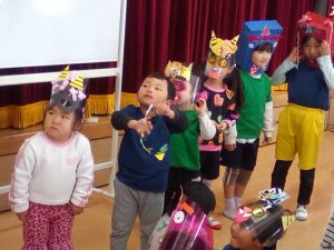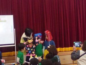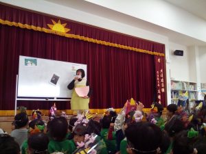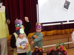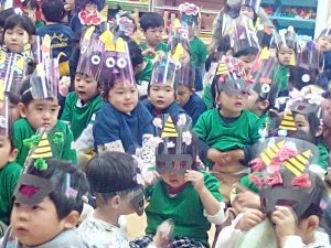 ホールに集まり、節分のお話とクイズ大会がありました。